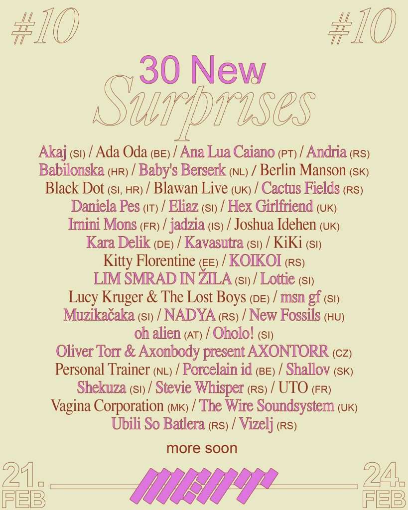 Dakle, najvežija pojačanja predstojećeg MENT festivala su Ana Lua Caiano iz Portugala, Baby’s Berserk iz Holandije, Daniela Pes iz Italije, Hex Girlfriend i The Wire Soundsystem iz Velike Britanije, Irnini Mons iz Francuske, Kara Delik iz Nemačke. Zatim su tu još i LIM SMRAD IN ŽILA, Oholo!, Kavasutra, Muzikačaka iz Slovenije, New Fossils iz Mađarske, oh alien iz Austrije. Listu kompletiraju Oliver Torr & Axonbody present AXONTORR iz Republike Češke, Porcelain id iz Belgije i Shallov iz Slovačke.