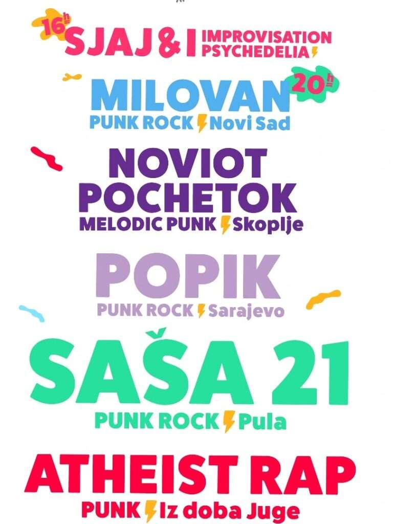 U subotu, dan kasnije 14. juna će pre koncertnog dela programa od 16 časova biti organizovana pank tombola, kao i razgovor na temu Muzika i ideje, umetnost i aktivizam. Svirke počinju od 20 časova, a na binu će te večeri izaći: novosadski pank-rokeri, Milovan, melodični pank sastav Noviot Pochetok iz Skoplja, te njihove kolege Popik iz Sarajeva. Za kraj Iluzije Slobode su ostavljena i najzvučnija imena, pulska institucija Saša 21, odnosno novosadski veterani Atheist Rap.