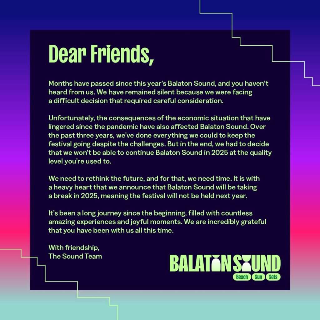 Balaton Sound, jedan od najvećih i najpopularnijih letnjih festivala u Mađarskoj, neće biti održan naredne godine. Organizatori su ovo potvrdili putem zvaničnih profila na društvenim mrežama.