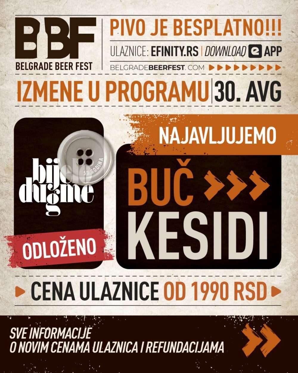Koncert Bijelog Dugmeta, zakazan za 30. avgust u okviru Belgrade Beer Festa, na inicijativu benda, biće odložen za jesen u beogradskoj Areni. Novi datum biće uskoro objavljen.