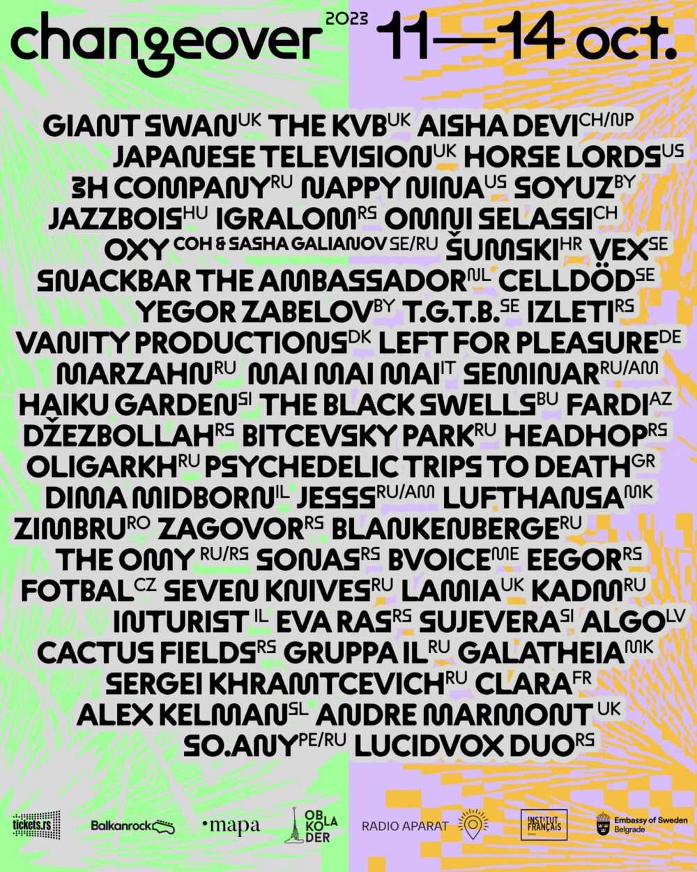 Drugo izdanje Changeover festivala održaće se od 11. do 14. oktobra na različitim lokacijama u srcu Beograda uključujući klubove, kulturne centre, jednu crkvu, prostor nekadašnje fabrike, i poznata mesta kao što su Dom Omladine, DIM, Drugstore, KC grad i Guvernanta.