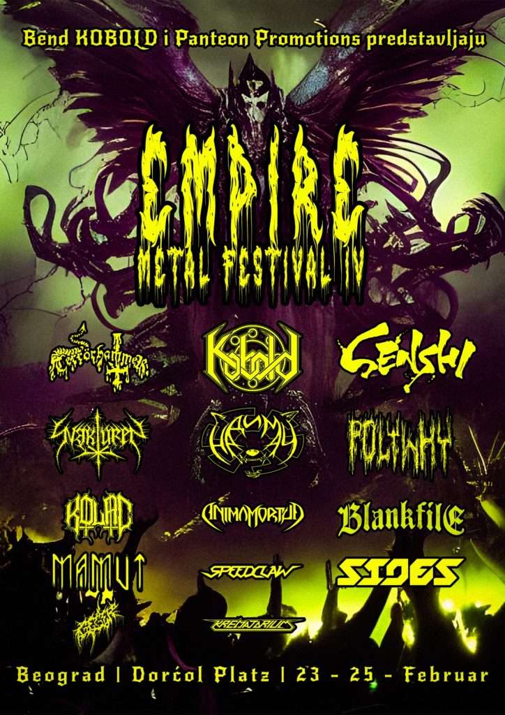Empire Metal Festival je događaj u organizaciji benda KOBOLD, kao hedlajnera, koji se održava dva puta godišnje u Beogradu, u zimskoj sezoni u zatvorenom prostoru i u letnjoj sezoni na otvorenom prostoru. Pogađate, sada je u pitanju zimsko izdanje koje će se održati od 23. do 25. februara u Dorćol Platzu.