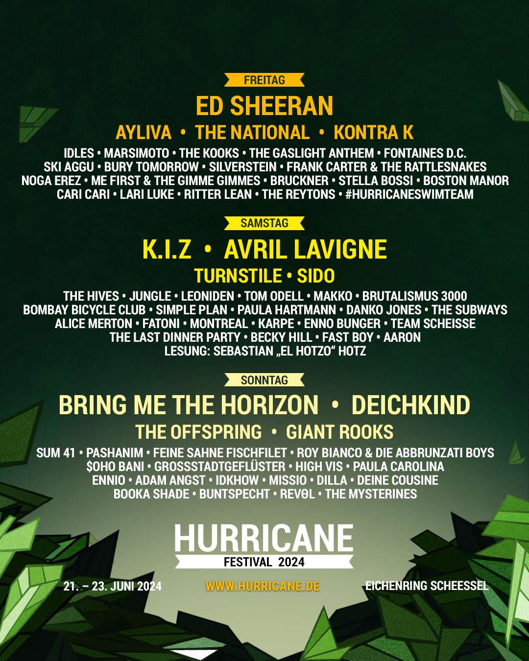 Održavajući se u opštini Šesel u blizini Bremena, Hurricane je doveo niz kultnih bendova u Nemačku od svog prvog izdanja 1973. godine, etablirajući se kao jedan od najtraženijih festivala u Evropi. Hurricane je obezbedio bogatu istoriju dok neprestano dovodi najsjajnija imena alternativnog roka, elektronike i pop muzike da nastupaju pred najvatrenijim posetiocima festivala u zemlji.
