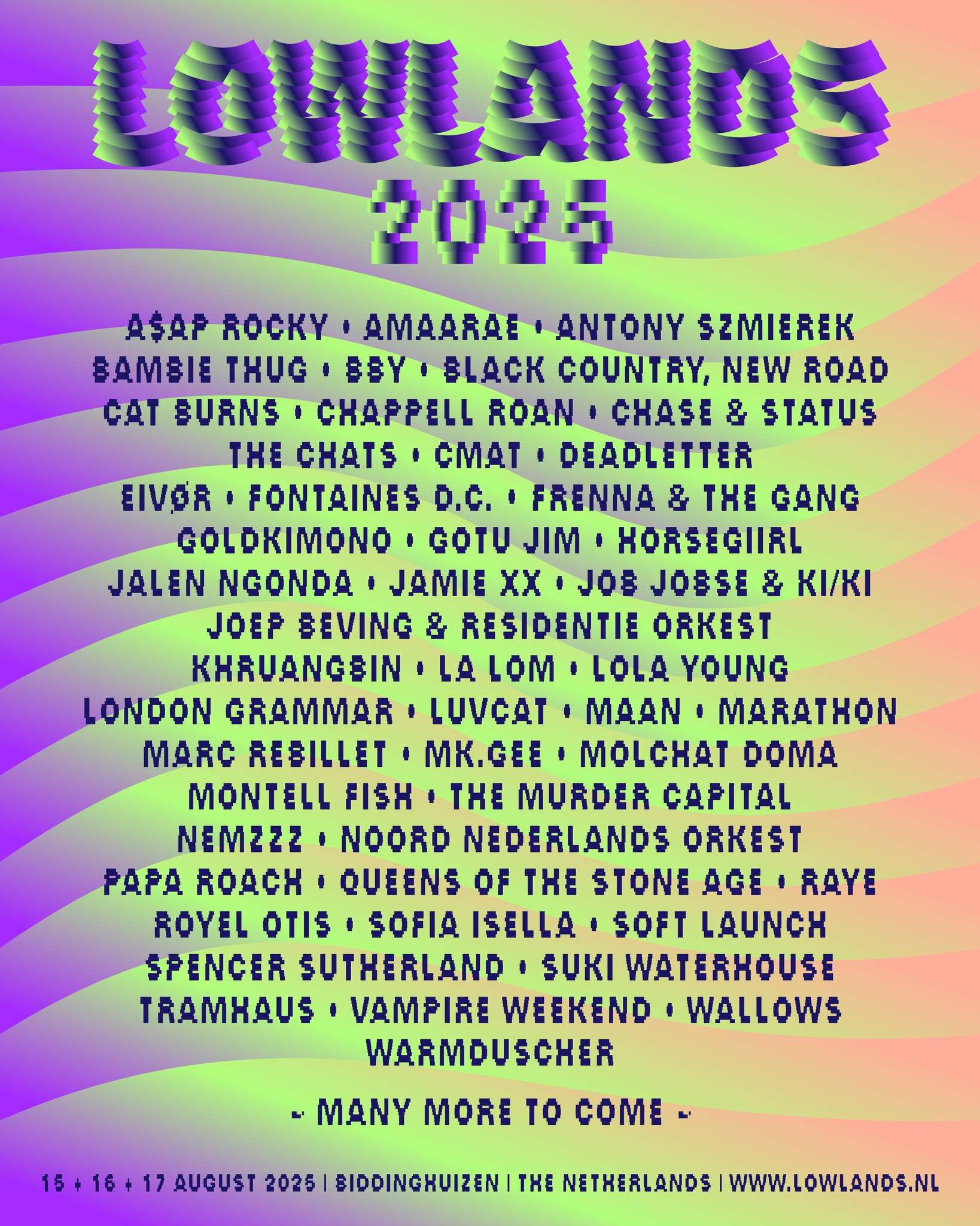 Trodnevna muzička manifestacija Lowlands se održava u holandskom gradiću Bidinghojzenu, sat vremena vožnje od Amsterdama. Verovatno najpopularniji festival u zemlji lala posetiocima nudi 12 stejdževa sa preko 250 izvođača koji se prostiru od najvećih imena u industriji do talentovanih, mladih bendova. Pored muzike, na ovde možete prisustvovati nastupima komičara, pozorišnim predstavama, izložbama, umetničkim i književnim radionicama.