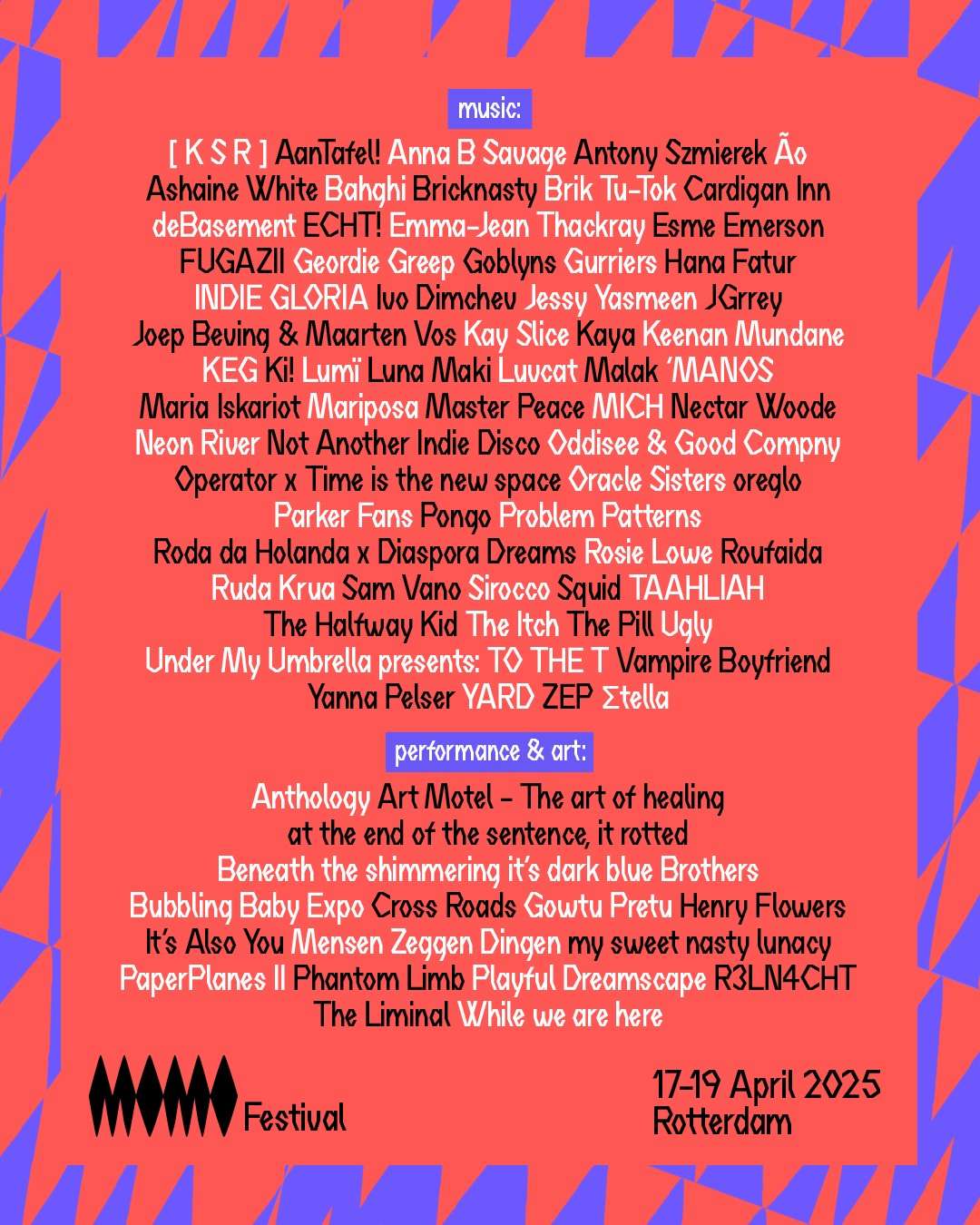 Motel Mozaique nudi program sačinjen od uzbudljivih umetnika/performera, ali iznad svega muzičkih stvaralaca. Lajnap vrvi od talentovanih izvođača koje samo čekaju da ih otkrijete. MOMO avantura odigrava se na više različitih lokacija u Roterdamu.