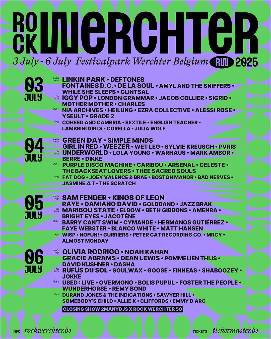 Rock Werchter je multi-žanrovski događaj koji se održava u Belgiji i jedan je od najdugovječnijih i najomiljenijih muzičkih festivala u Evropi. Ovaj gigant na evropskoj muzičkoj mapi dočekuje više od 150.000 obožavalaca iz godine u godinu da nudeći im koncerte nekih od najvećih svetskih bendova. Ukoliko postoji hedlajner koga želite da vidite tokom leta, velika je šansa da ćete ga pronaći na posteru Rock Werchtera.