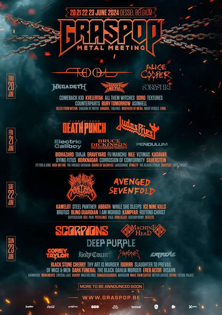 Predstavljanje hedlajnera za Graspop traje već nekoliko nedelja, pa je već od ranije poznato kako će se tamo naći Judas Priest i Five Finger Death Punch (21. jun), zatim Bring Me The Horizon i Avenged Sevenfold (22. jun), te Scorpions i Machine Head (23. jun), dok je juče obelodanjeno kako će se grupi Tool prvog dana pridružiti Alice Cooper (20. jun).