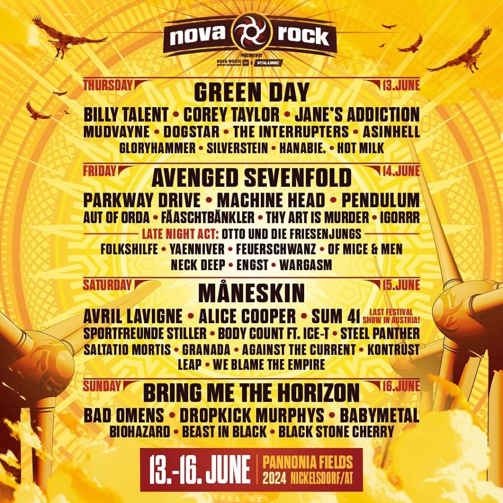 Organizatori narednog Nova Rock festivala objavili su prvi, veliki talas imena koji će nastupati predstojećeg juna u Austriji. Među najzvučnijim imenima su Green Day, Avenged Sevenfold, Bring Me The Horizon i Måneskin.