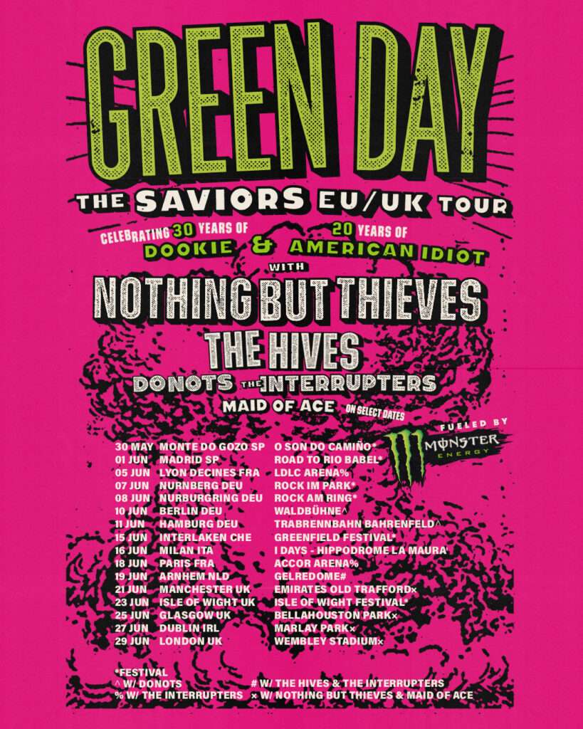 Na predstojećoj turneji pop-punk trio – kojeg čine Billie Joe Armstrong, Tré Cool i Mike Dirnt – sviraće po Severnoj Americi, Velikoj Britaniji i kontinentalnom delu Evrope u sklopu promocije njihovog novog albuma Saviors koji bi 19. januara 2024. godine trebalo da ugleda svetlost dana. Povrh toga, naredne godine bend proslavlja trideset godina od objavljivanja njihovog klasika iz 1994. Dookie, kao i dvadeset godina od ploče American Idiot (2004).