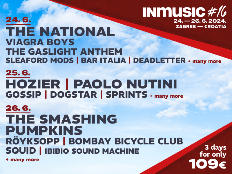 The Smashing Pumpkins, Hozier, The National, Paolo Nutini, Röyksopp, Gossip, Viagra Boys, Dogstar, Bombay Bicycle Club, The Gaslight Anthem, Squid, Sleaford Mods samo su neka od imena koja će nastupiti na 16. izdanju INmusic festivala. Kompletna festivalska satnica dostupna je putem ovog linka.
