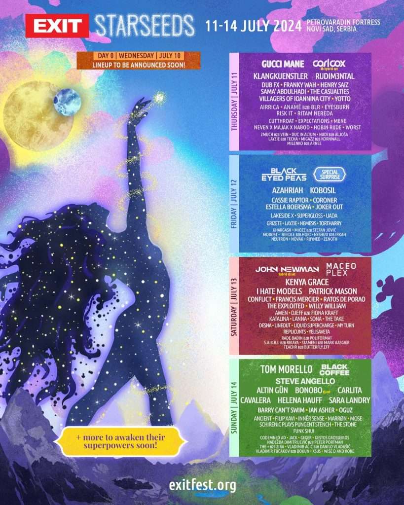 Naredno izdanje EXIT festivala, sa temom EXIT Starseeds i sloganom „Probudimo naše supermoći zajedno“, biće održano od 11. do 14. jula na Petrovaradinskoj tvrđavi, uz nulti dan, 10. jul, rezervisan za posebni Starseeds Takeover performans na Tesla Universe bini. Četvorodnevne ulaznice po promo ceni od 6.990 dinara i uz uštedu od 50% dostupne su ovde, kao i na Gigs Tix prodajnim mestima i online.