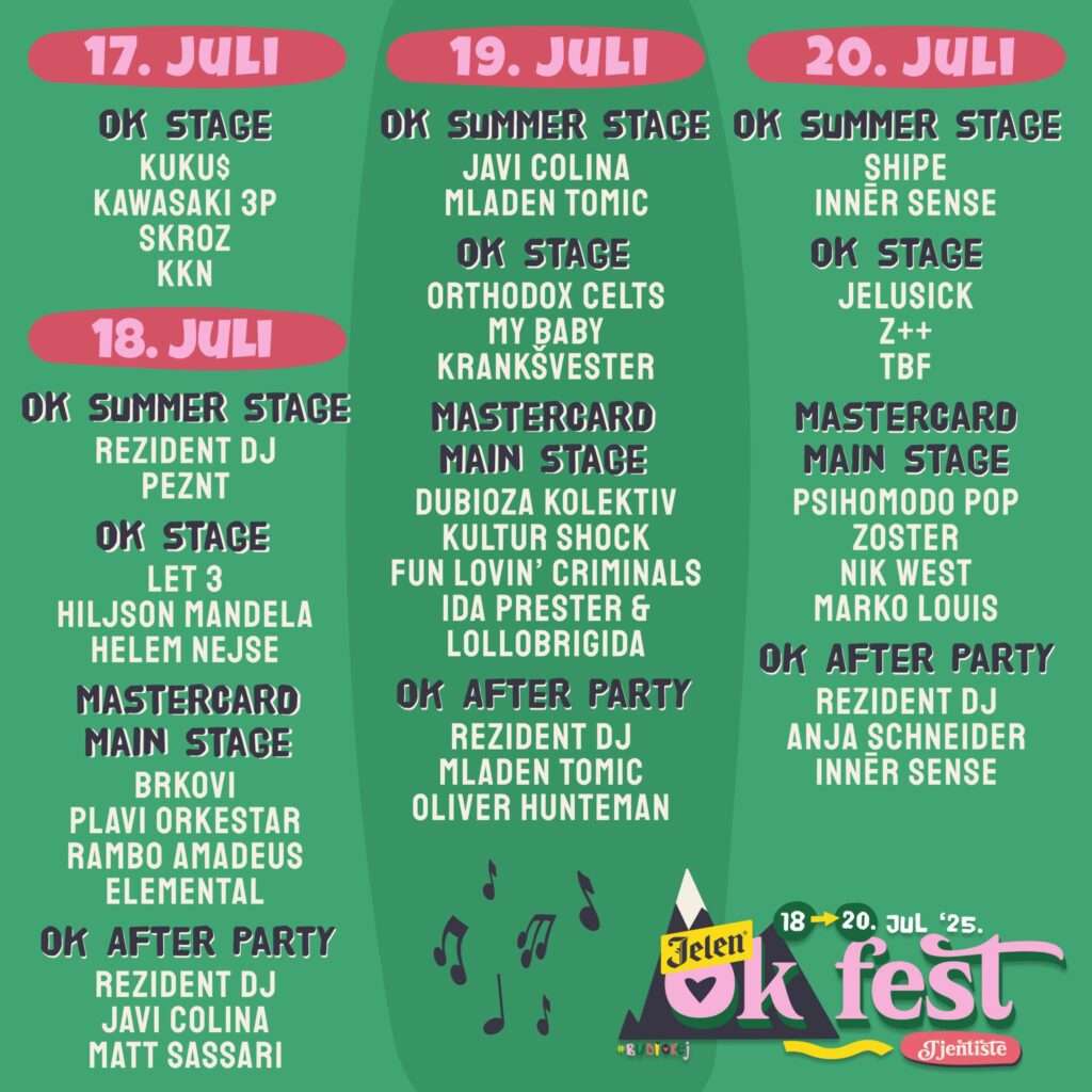 Predstojeći OK Fest na programu je od 18. do 20. jula na dobro poznatoj lokaciji na Tjentištu u NP Sutjeska. Pored mnoštva koncerata, posetioci mogu uživati u raznim drugim sadržajima poput filmskih projekcija, adrenalinskim avanturama i predivnom prirodnom okruženju. Uskoro će biti najavljena nova imena koja će činiti ovogodišnji trodnevni program Jelen OK Festa. Sve informacije o festivalu dostupne su na zvaničnoj web stranici.