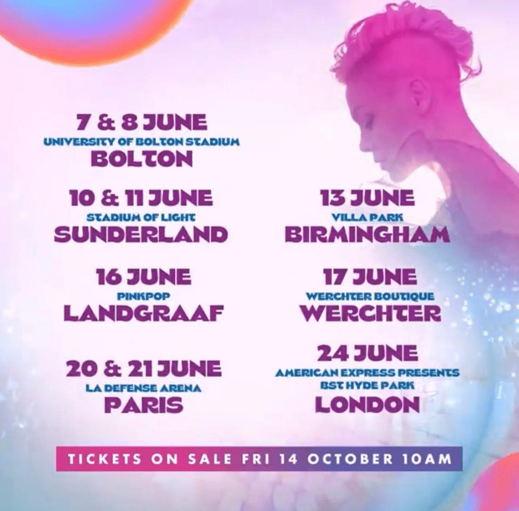 Poznati su i ostali datumu njene evropske turneju u junu naredne godine, a pored Pinkpopa, P!NK će istog vikenda nastupati u Belgiji na jednodnevnom festivalu Werchter Boutique.