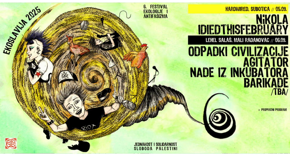 Šesti festival ekologije i antifašizma Ekoslavija u Subotici održava se 5. i 6. septembra 2025. (petak i subota) u klubu Hardwired – Čvrsto povezani i na Lehel salašu/ranču, Mali Radanovac, Subotica.