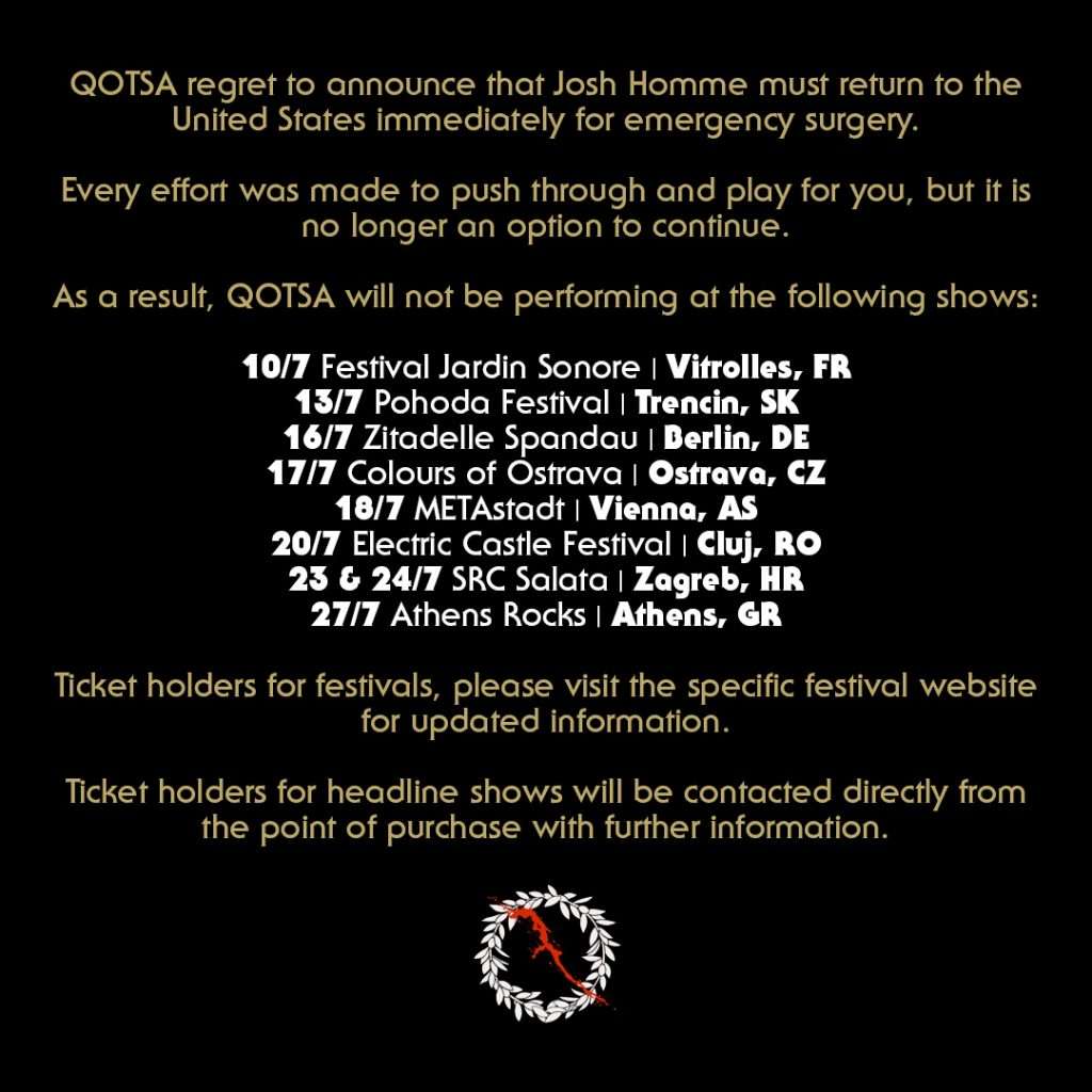 Organizatori nastupa saopštavaju sledeće: “Josh mora hitno u Sjedinjene Države na operaciju. Bend će pokušati dogovoriti nove datume za oba zagrebačka koncerta, odnosno odgoditi ih za sam kraj leta”.