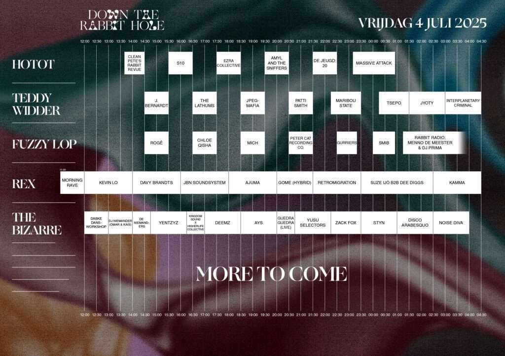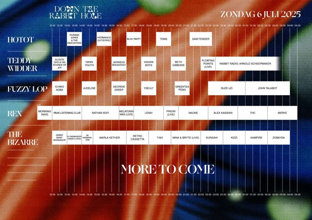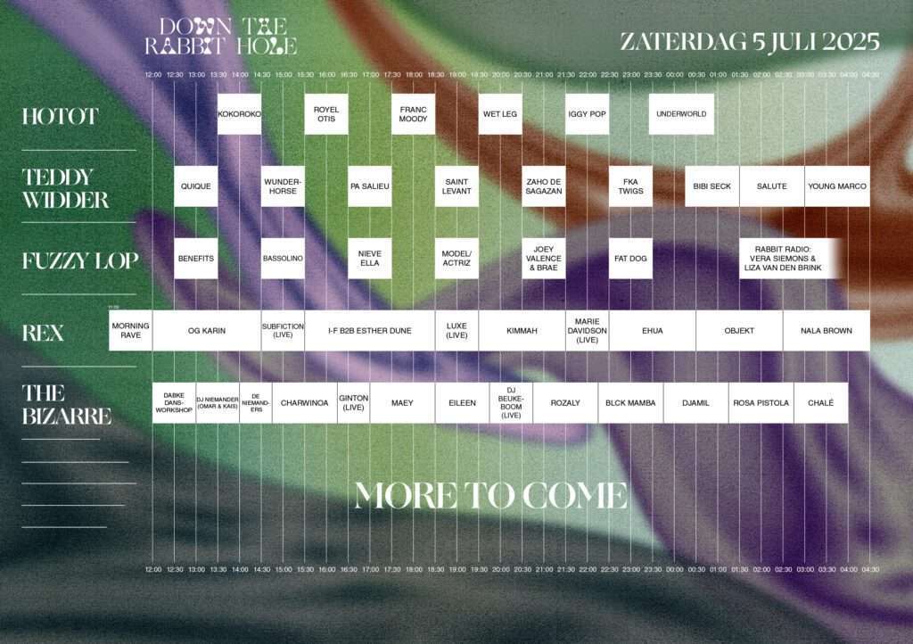 Down The Rabbit Hole, jedan od najpopularnijih holandskih festivala, sa novih 16 izvođača predstavlja kompletan muzički program predstojećeg izdanja. Pored toga, objavljena je i satnica, odnosno raspored nastupa po binama.