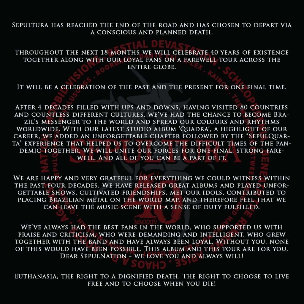 Kultni sastav Sepultura prestaje sa radom. Brazilski thrash metal veterani otkrili su da će se otisnuti na 18-mesečnu oproštajnu svetsku turneju. Serija koncerata uključivaće i evropske datume na jesen 2024. godine.