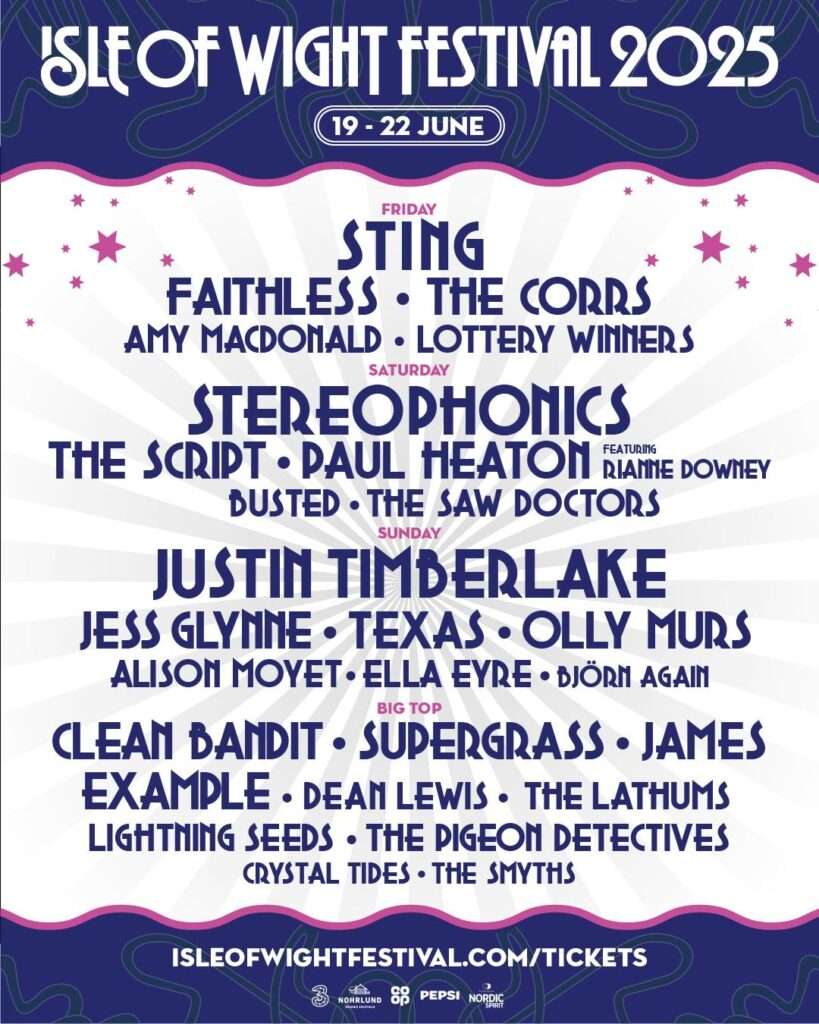Drugi talas izvođača najavljen je za Isle Of Wight 2025. Program pojačavaju imena kao što su Supergrass, Jess Glynne, Busted i drugi.