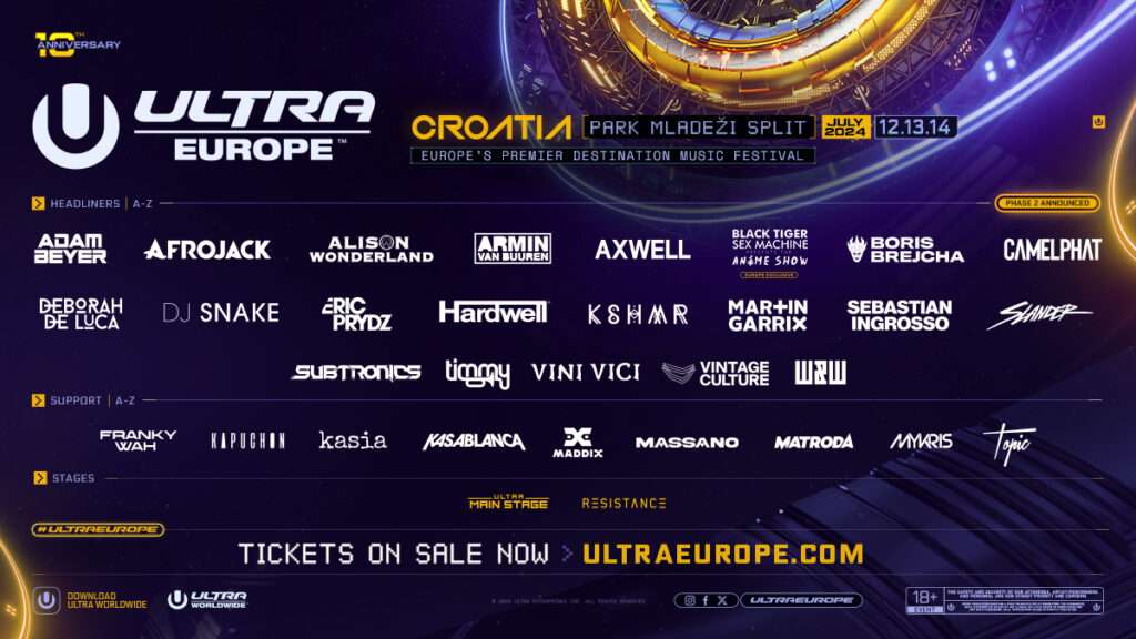 Nekoliko ozbiljnih imena se pridružuju ranije najavljenim hedlajnerima. Među njima su AFROJACK, Sebastian Ingrosso, Axwell, DJ Snake, W&W, KSHMR i Vini Vici. Ali, žurka se ne zaustavlja ovde pošto Subtronics, SLANDER i Alison Wonderland dolaze u Hrvatsku, zajedno sa Black Tiger Sex Machine, koji donosi Anime Show na Ultra Europe. Među dodatnim imenima koji će preuzeti RESISTANCE stage su Vintage Culture, CamelPhat i Deborah De Luca.